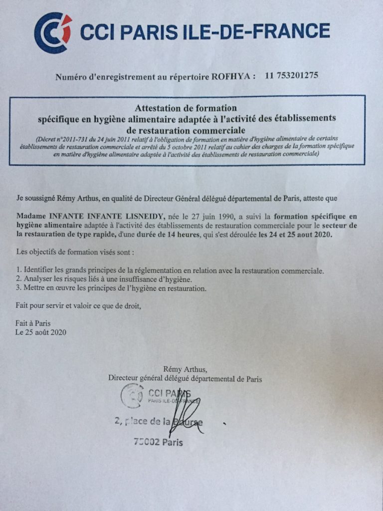 Je suis diplômée du stage en Hygiène Alimentaire et Sécurité Sanitaire, formation dispensée par la Chambre de Commerce et de l’ Industrie.